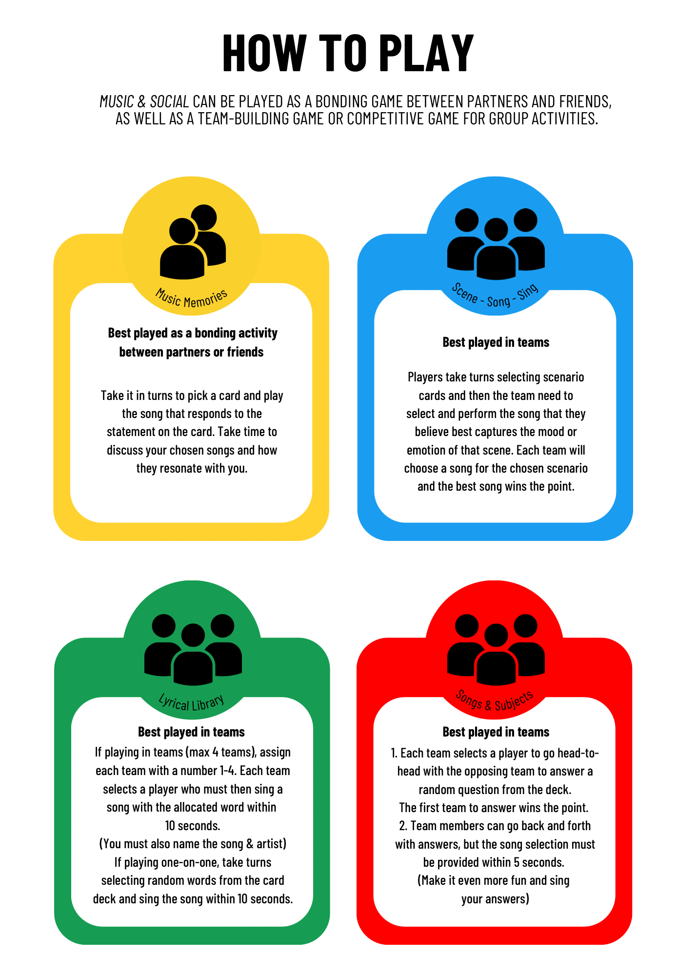 We have rules on how to play, but we encourage you to play in whatever way brings you the most joy. Feel free to add your own twists, like forfeits for losing teams or players (Perhaps a shot to spice things up!).